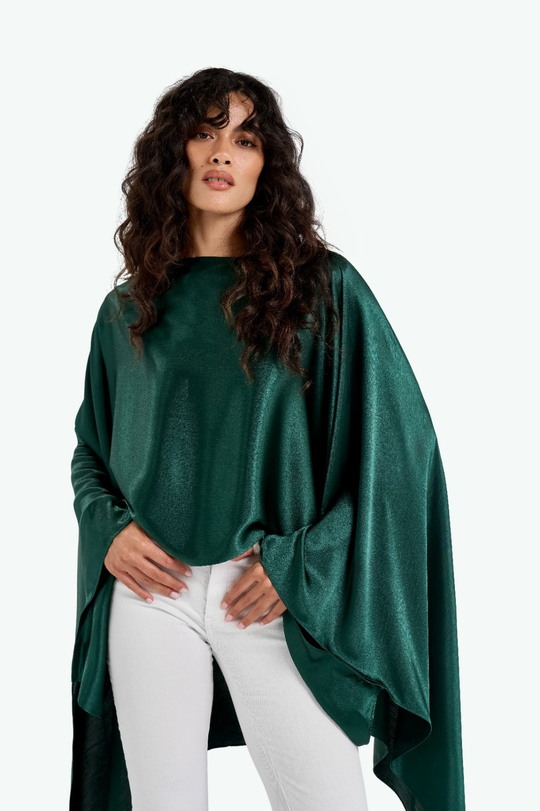 An airy satin poncho designed for effortless elegance and serene moments. Its fluid silhouette brings sophistication to any look. Please handle with care. Satin is a delicate luxury.
